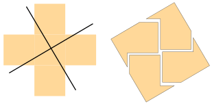 With two straight lines, cut the Swiss Cross into four congruent pieces (same size and shape) which then fit together to make a square.