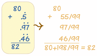 The remarkable feature being that a proper fraction divided by 9s e.g. 46/99 is exactly equal to the numerator with the repeater sign followed by the decimal.